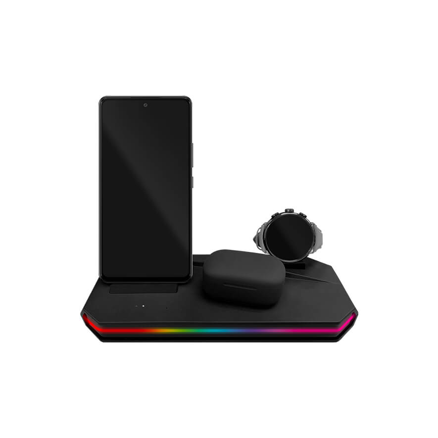 • 10W wireless charger • With RGB decorative light • Sound-Controlled RGB Lighting Effects: Built in High Sensitive Pickup Mic • Charge your smartphone, smart watch and TWS in one go *Smart watch charger is not included