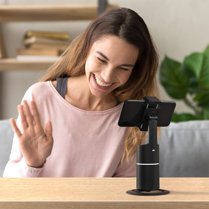 • 360° Rotation stand • Built-in camera for face/body tracking • App free • Smartphone clamp can hold devices with up a screen size of up to 6.4"