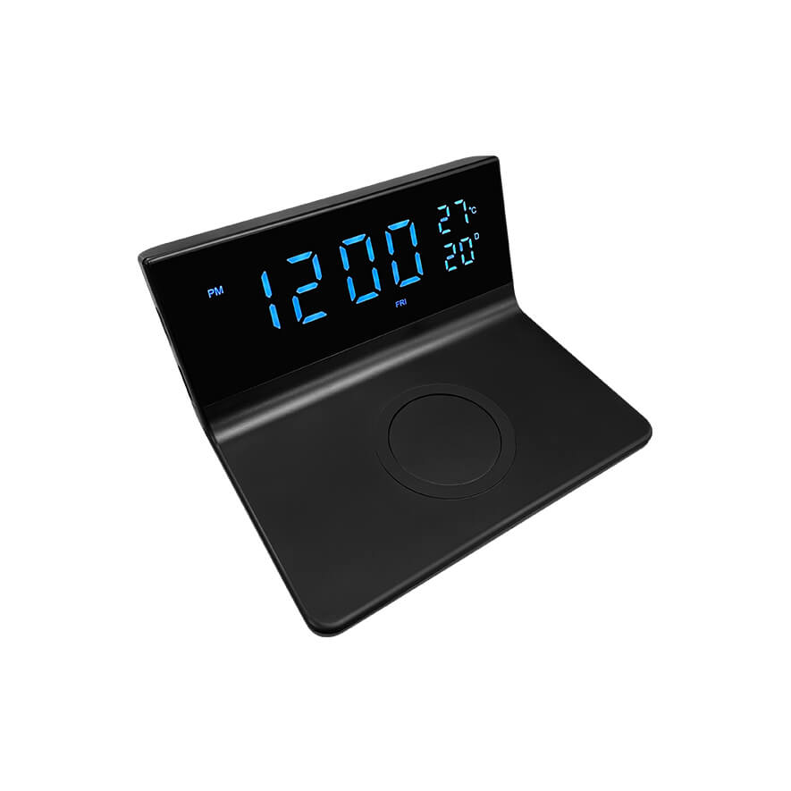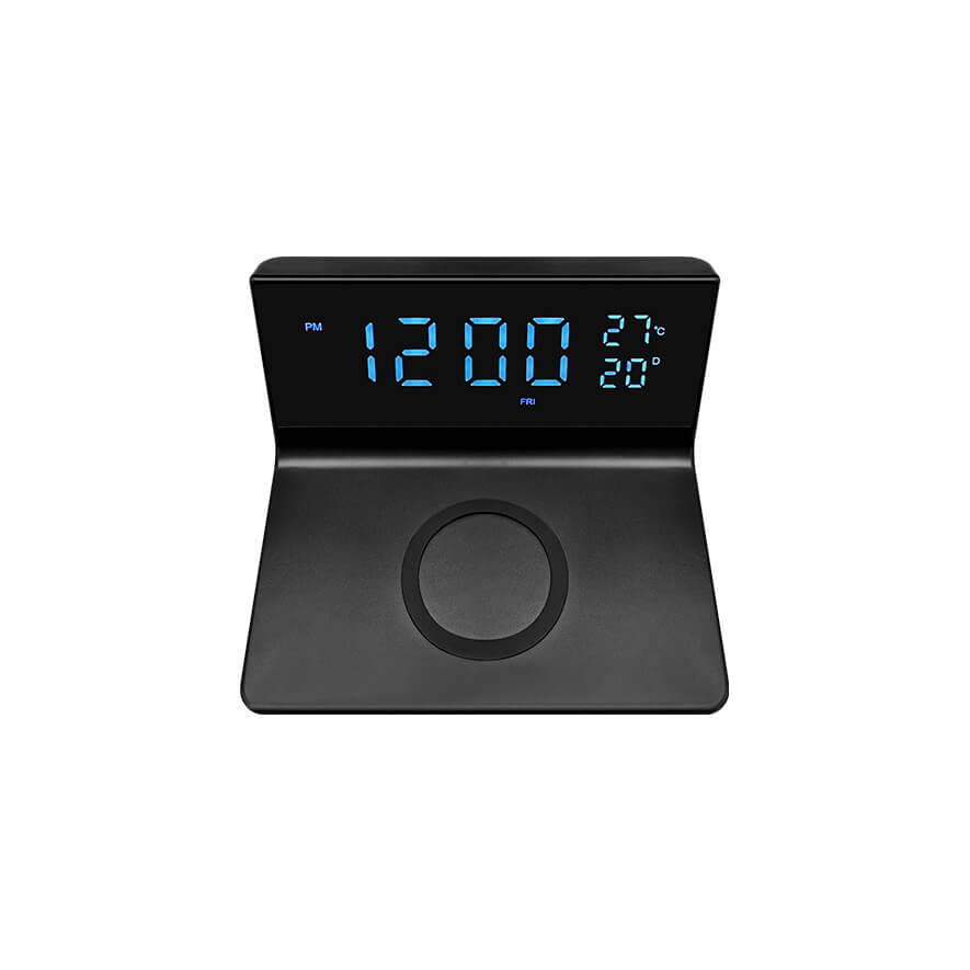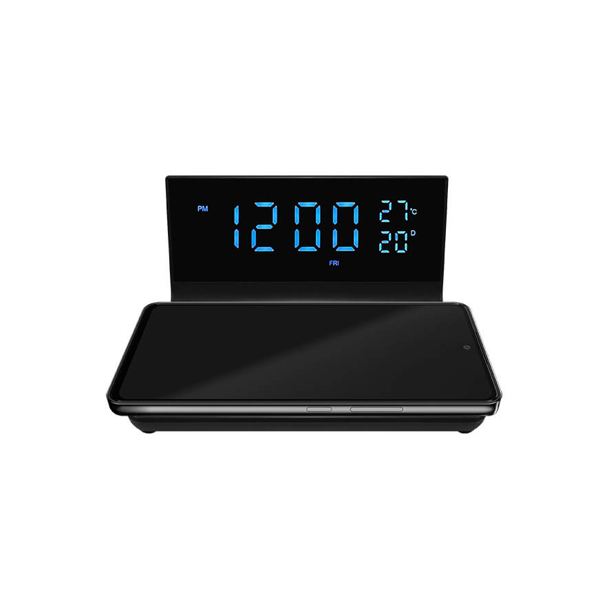 • Input power: DC 5V 3A, 9V 3A, 12V 2A (Max.) • Output power: 5W, 7.5W, 10W, 15W (Max.) • Display brightness: 3 levels • Function: Alarm clock, Calendar, Temperature, 12H/24H mode, Snooze function