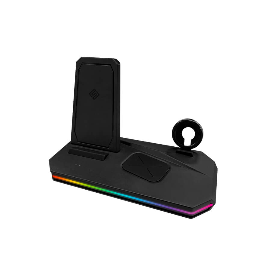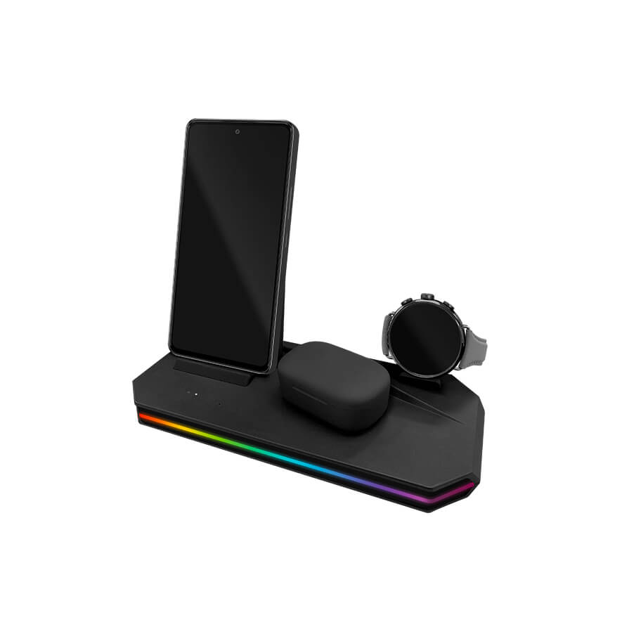 • 10W wireless charger • With RGB decorative light • Sound-Controlled RGB Lighting Effects: Built in High Sensitive Pickup Mic • Charge your smartphone, smart watch and TWS in one go *Smart watch charger is not included