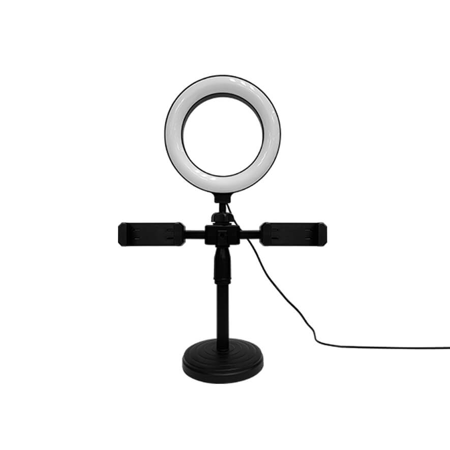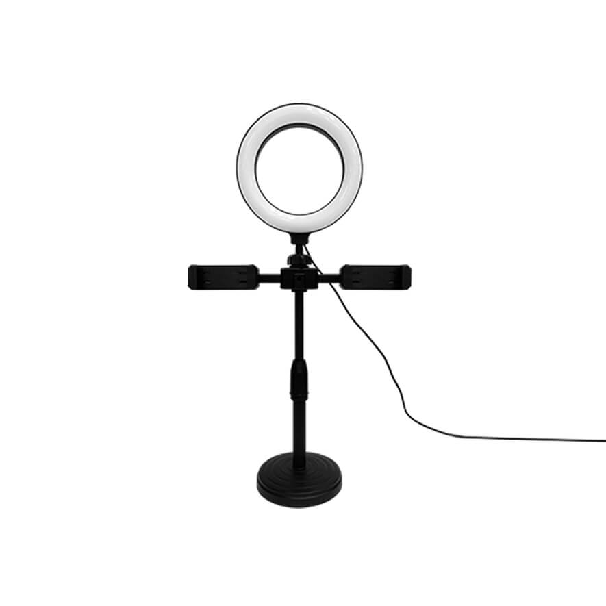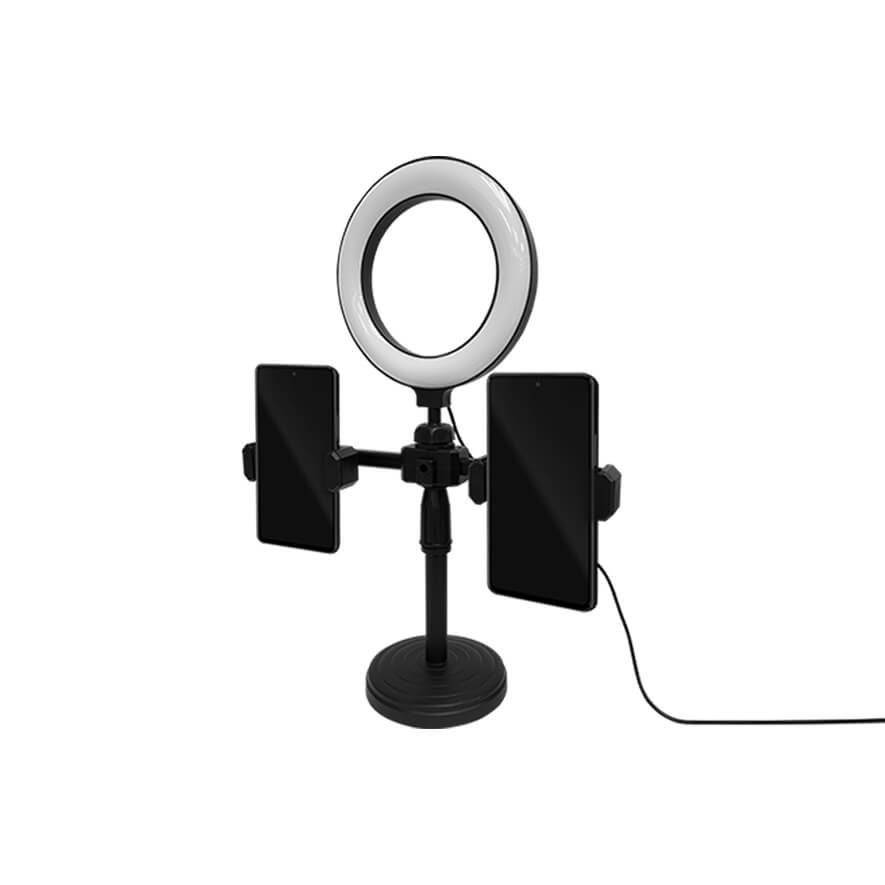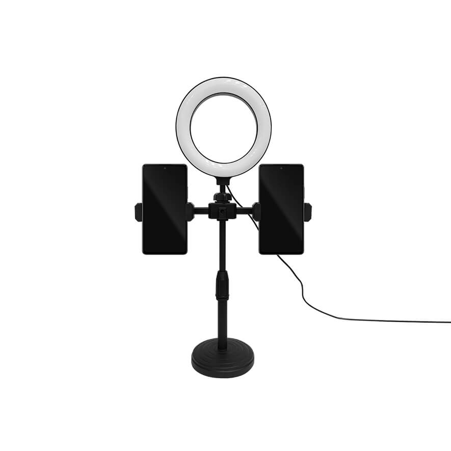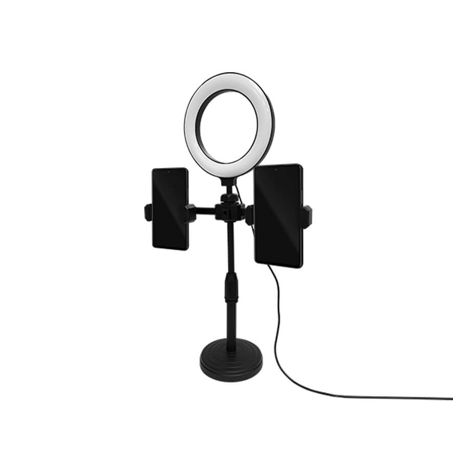 • Smartphone clamp can hold devices with up a screen size of up to 6.4" • Height adjustable stand • 3 brightness levels and 3 colour temperatures for the light. • Tilt and rotate the phone mount to adjust the shooting angle • 6" ring light measures 6"