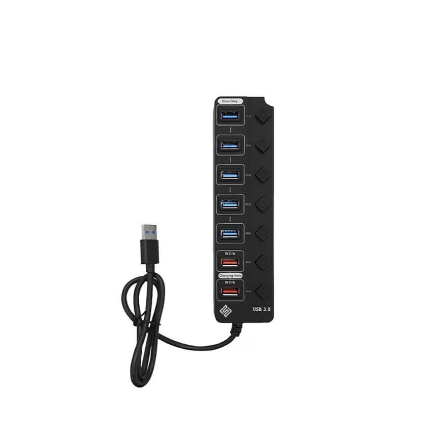 • USB Ports: 3.0 x 7 • Transfer speed: up to 5 Gbps • Compatibility: 1.1, 2.0, 3.0 USBs • Dedicated charging port: 2 • Charging port output: 5V 2.1A Max. • Power adaptor input: 12V 2A Max. • Features: LED status indicator, power button for each port