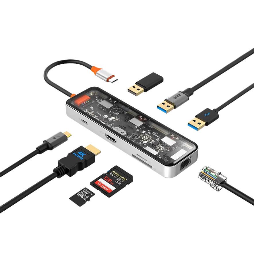 • With transparent cover • USB 3.0 interface • Features 3 x USB 3.0 ports, 1 x Type-C PD port, 1 x RJ45 port, 1 x HDMI port, 1 x SD card slot, 1 x TF card slot • PD 100W • 4K HDMI output offers 30Hz video and audio • Compatible for use with various operating systems