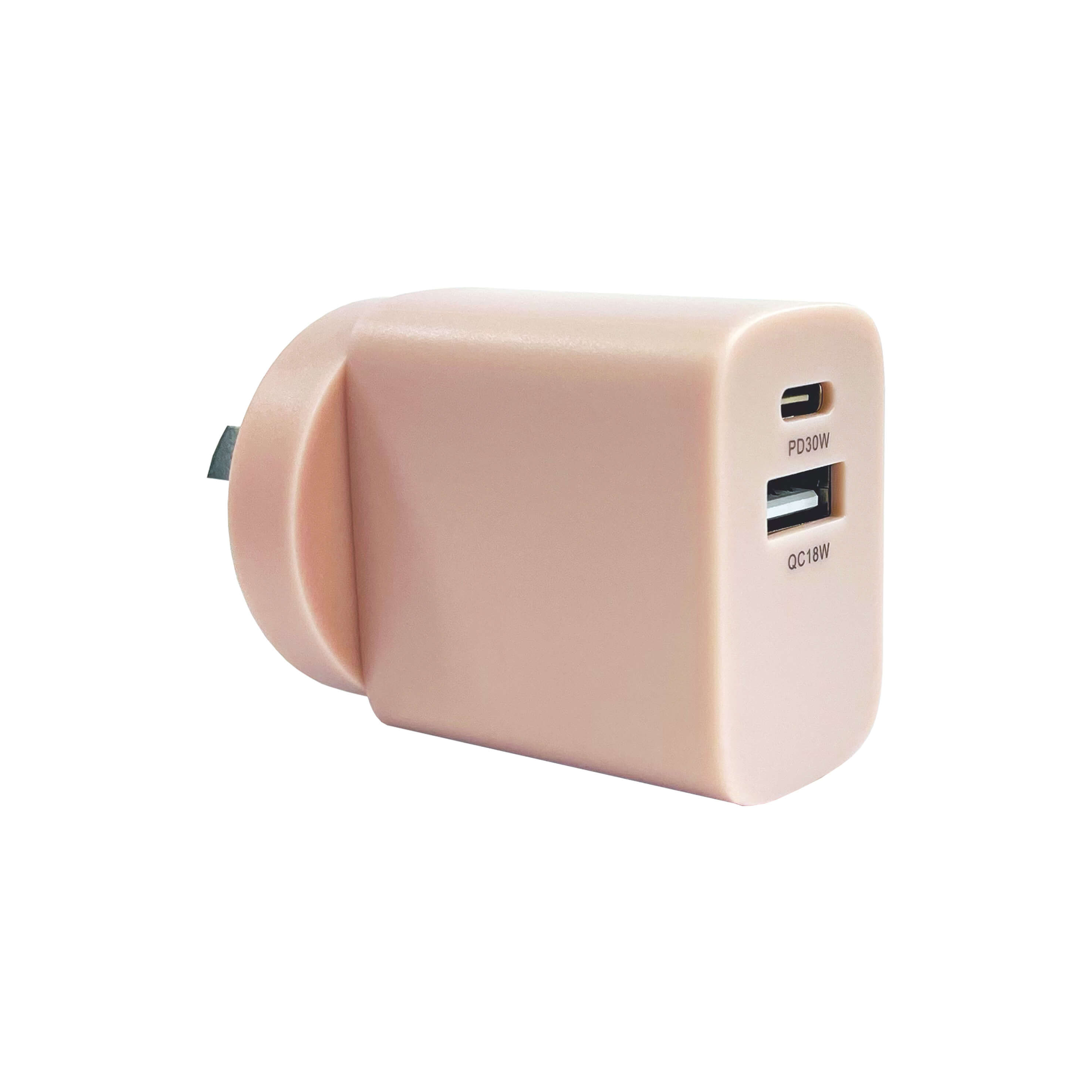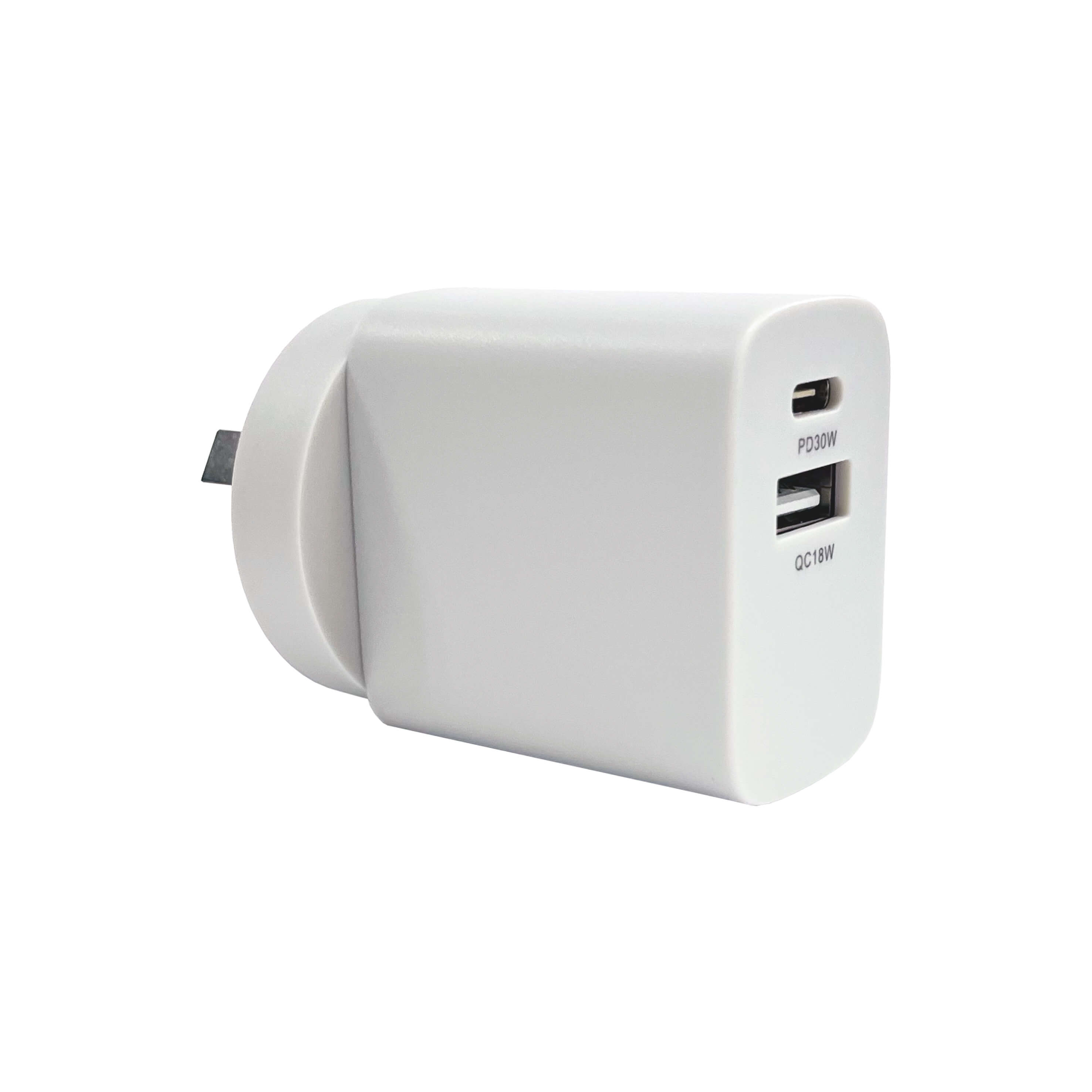 • AU pin • Connector: USB C, USB A • Input power: DC 100-240V~50/60Hz 1A(Max.) • USB A output port: 5V 3A/ 9V 3A/ 12V 1.5A • USB C output port: 5V 3A/ 9V 3A/ 12V 2.5A/ 15V 2A/ 20V 1.5A • Total output: 5V 3A (Max.)
